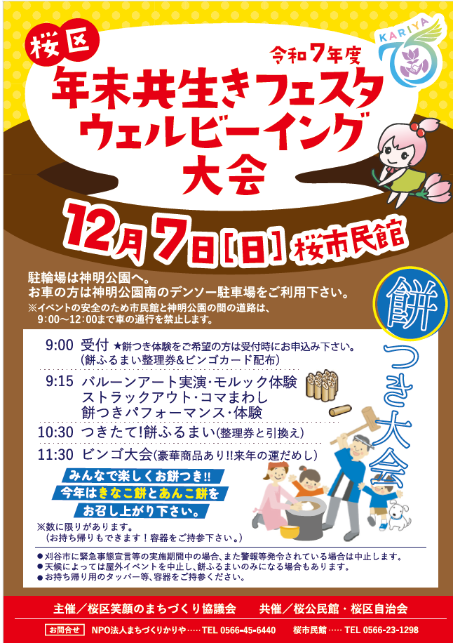 - 桜区年末共生きフェスタウエルビーイング大会12月7日(日)桜区年末共生きフェスタウエルビーイング大会が桜市民館及び神明公園で開催され、餅つき体験、モルック体験、輪投げ体験、ターゲットゲーム体験、ビンゴ大会が行われました。