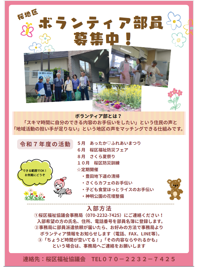 - 桜地区ボランティア部員募集桜地区ボランティア部員募集のチラシを掲載しました。住民の皆様、応募をお願い致します。